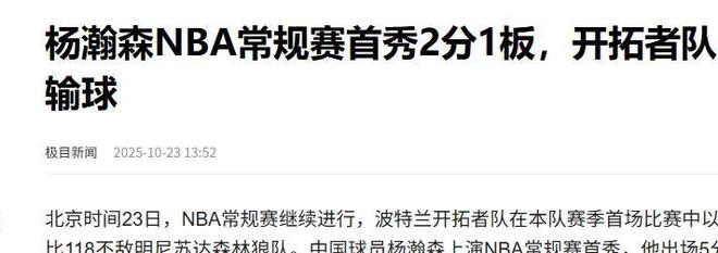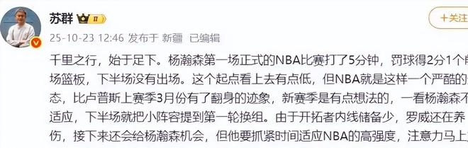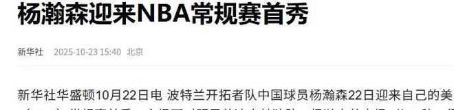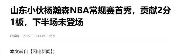 环球网:(山东小伙杨瀚森NBA常规赛首秀,贡献2分1板,下半场未登场2025.10.23)