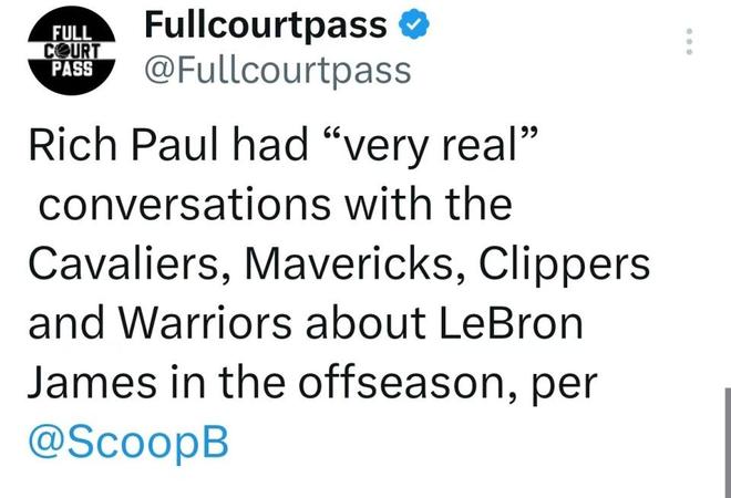 北京时间1月3日,虽然詹姆斯的经纪人里奇-保罗认为詹库联手根本不可能发生,但据美记布兰登-罗宾逊报道,里奇-保罗曾在休赛期与四支球队进行过试探性但极具实质意义的对话,讨论关