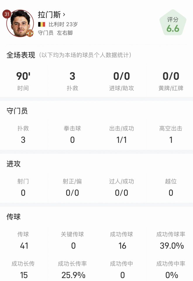 雷速体育10月4日宣 英超第7轮,曼联在主场以2-0的比分战胜桑德兰。今夏加盟曼联的门将拉门斯完成首秀。拉门斯此役关键数据:评分: 6.6时间: 90'扑救: 3出击/成功: 1/1高空出击