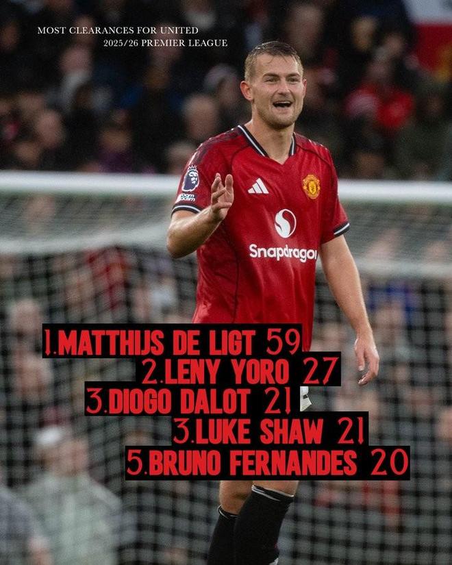 曼联官方统计本赛季队内英超解围榜:德利赫特断崖式领先