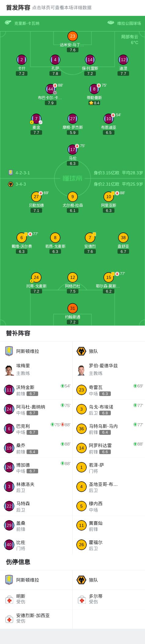 北京时间11月30日,英超联赛第13轮,阿斯顿维拉坐镇主场迎战狼队。比赛中,尤尔根-拉森进球被吹。麦金送出助攻,布巴卡尔-卡马拉世界波破门打进全场唯一进球,大马丁屡献神扑力保城池